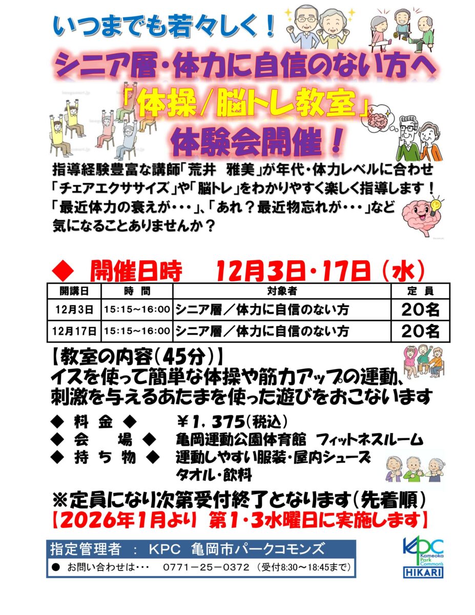 低体力者/高齢者向けプログラム 低体力者/高齢者向けプログラム 2025.11.08 NEXT こちらもチェック MENU お知らせ一覧 亀岡運動公園からのお知らせ 25.10.1 忘れ物・落し物の保管期間について 施設・公園内での忘れ物・落し物の保管期間は 拾得した月を含む3カ月… > 一覧 イベント一覧 季節のイベント 25.11.8 低体力者/高齢者向けプログラム … 25.4.20 亀岡運動公園ウォーキングイベント開催! … > 一覧 株式会社光製作所 ゼット株式会社 グローブシップ株式会社 オンライン予約システムサポートページ