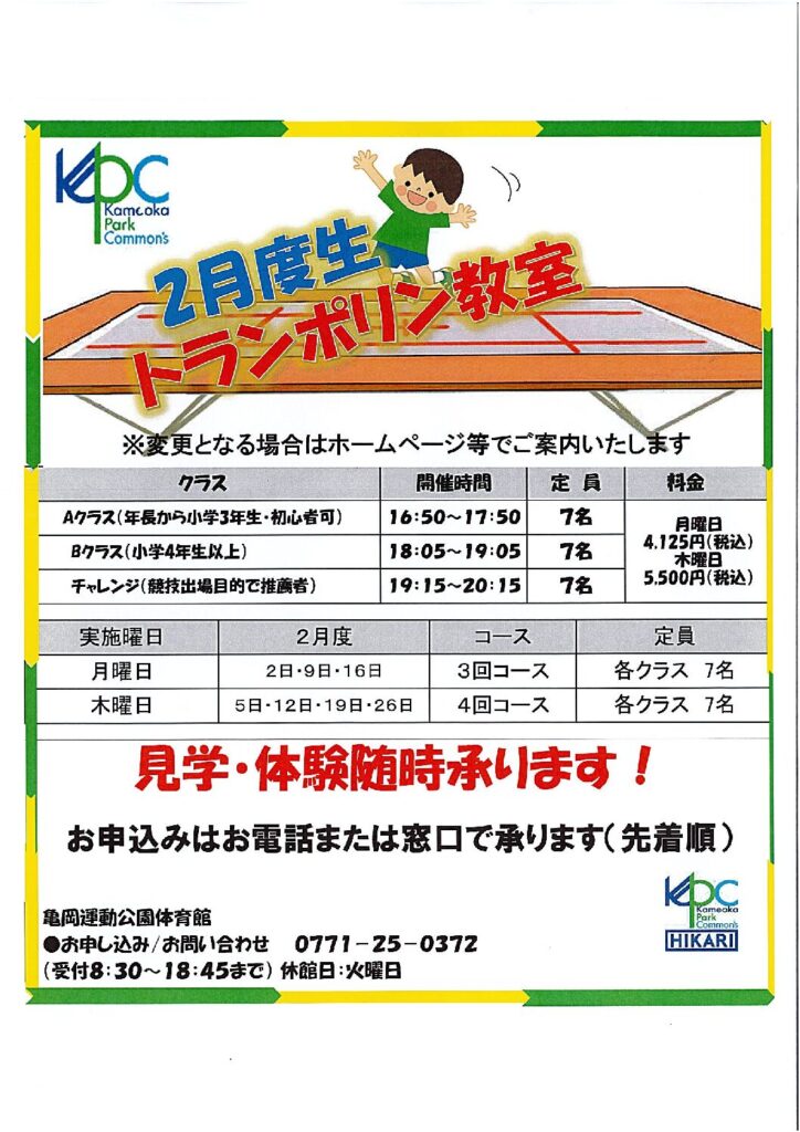 亀岡運動公園体育館では月曜日・木曜日に「トランポリン教室」を開講しています。